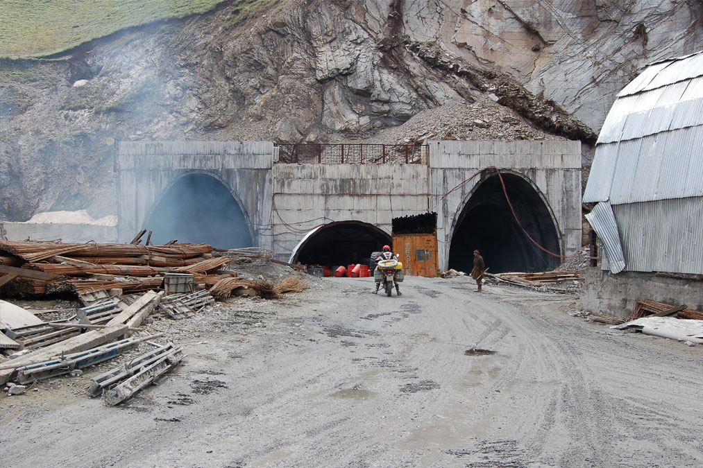Und dann kommt er: der berühmt berüchtigte Pass von Anzob, oder besser: der Tunnel unter dem Pass von Anzob. Ich hatte schon Videos davon auf Youtube gesehen, aber der Anblick im Original ist schon beeindruckend. Zwei große Tunneleinfahrten, die rechte OK, die Linke voller Qualm und dazu Wasser soweit man sehen konnte. Die schlechte Nachricht ist, dass wir durch die linke Röhre müssen, die gute Nachricht ist, dass das Wasser im Tunnel nur Kniehoch steht.